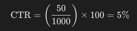 Exempel: Om en annons visas 1 000 gånger och får 50 klick, skulle CTR beräknas som: